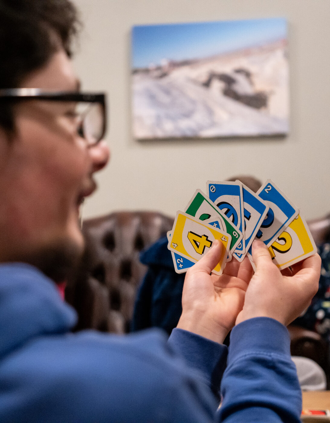 A group of young people sitting in a bright, airy space with large windows. Two individuals are engaged in conversation, while one person is taking a selfie. The atmosphere is relaxed and friendly, with wicker chairs and a small table in the center. Green trees are visible outside the windows, adding to the cheerful ambiance.